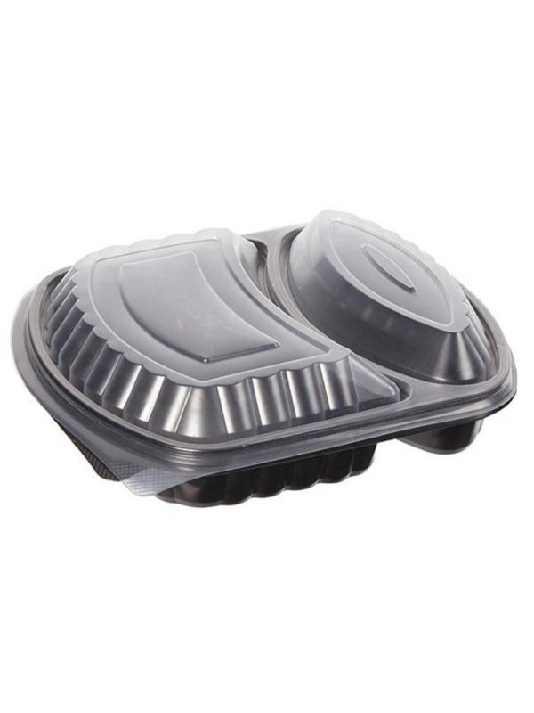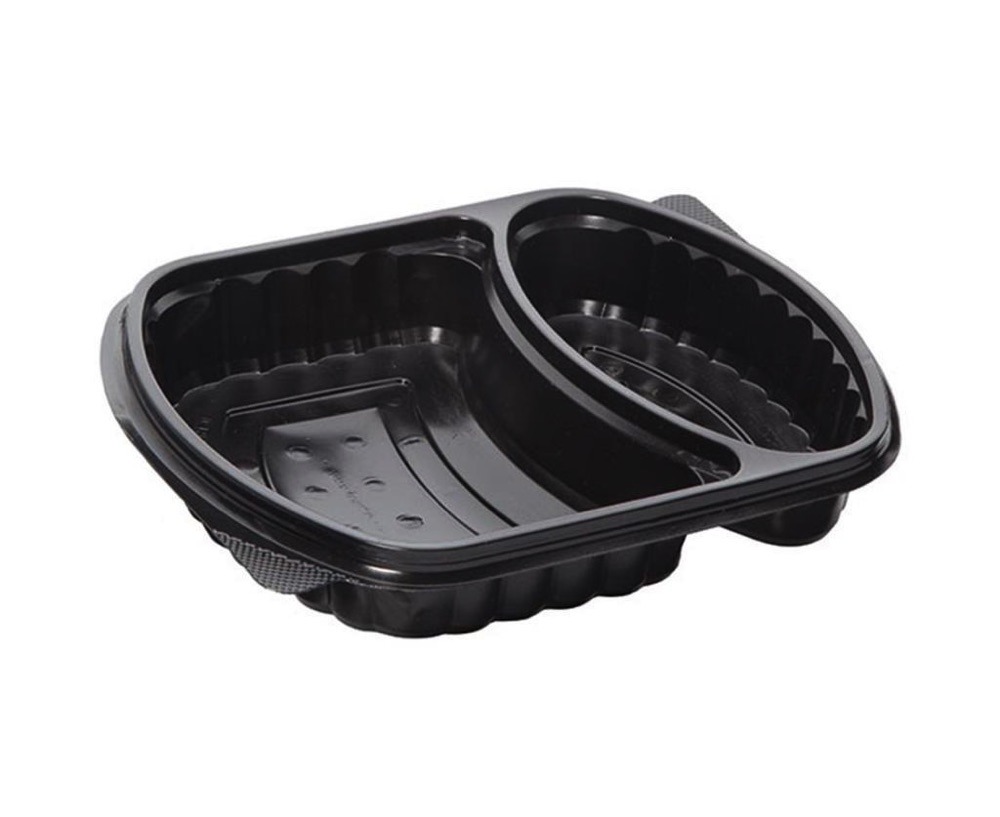 2 Bölmeli Kapaklı Gıda Kabı (Sıcağa Dayanıklı), siyah renkli alt kabının ölçüleri içten içe 17 cm eninde, 20 cm boyunda, 3 cm derinliğinde ve şeffaf renkli kapağının ölçüleri içten içe 16 cm eninde, 19 cm boyunda 3 cm yüksekliğinde plastik mikrodalgaya girebilen, ısıya dayanıklı, tek kullanımlık, 2 bölmeli ve paket servise uygun sıcak servis setidir.
