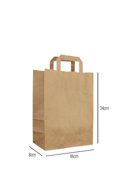 19 cm eninde, 24 cm boyunda ve 8 cm taban genişliğinde, baskısız, burgu saplı, 100 gr kağıttan kaliteli, mini boy kraft kağıt çanta.
